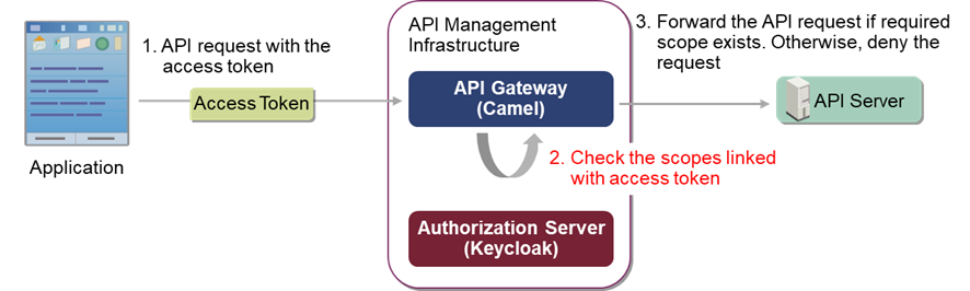 API management infrastructure can check the scopes included in access token to confirm whether the client application is allowed to access the requested API. If the required scope is not included, the API request will be denied.